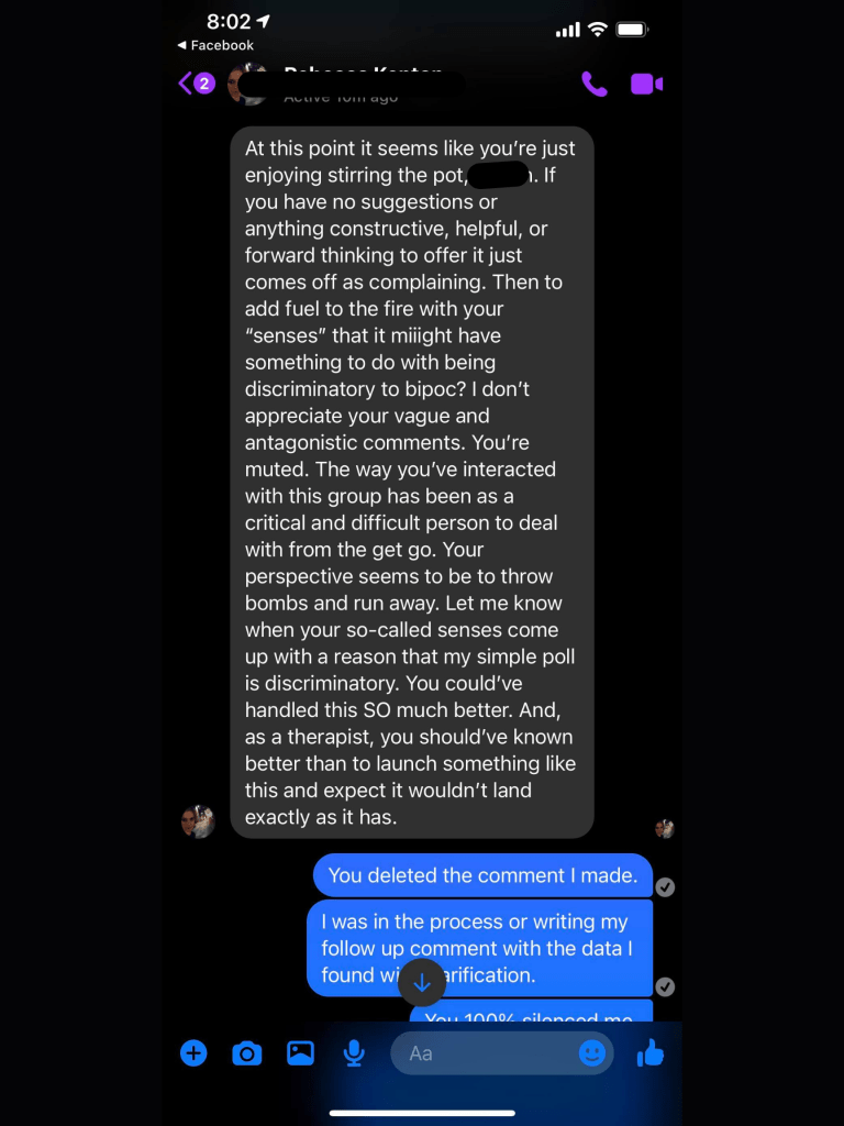 The Admin addressed the group member who called out the problematic behavior stating that the group member’s accusations on the post were “inappropriate” given the intended nature of the post. The group member was then invited to create a separate post in which their allegations could be brought to light. What I got from the Admin’s response was that there’s a time and place for everything? Drawing lines where problematic behaviors or practices should or shouldn’t be discussed is problematic within itself. The group member then questioned the Admin’s judgement call and our comments, not the post, were deleted after a few exchanges. I’ll let that marinate.