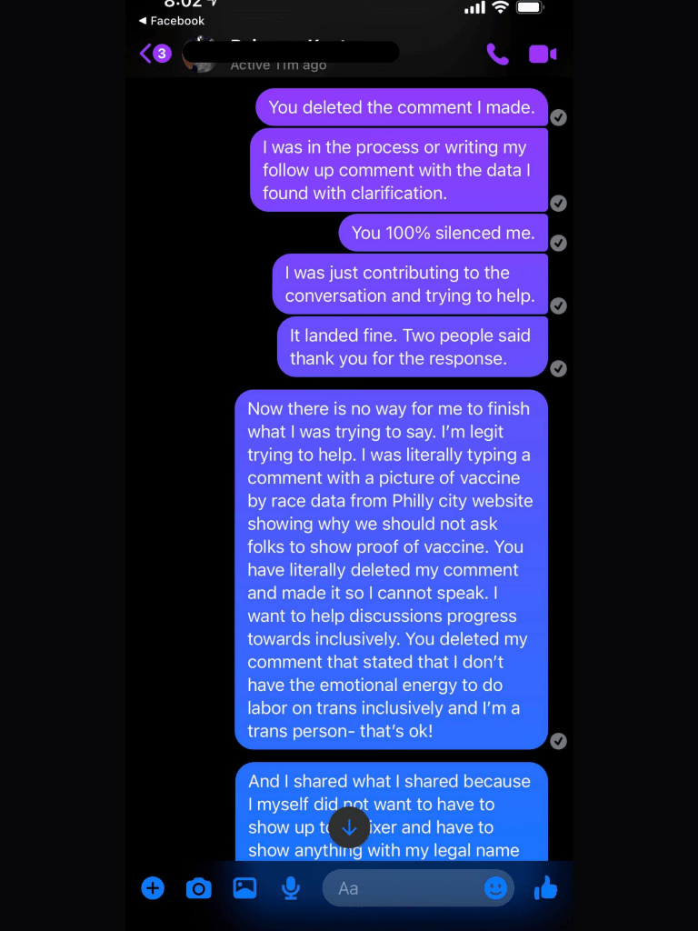 “Hey there, my name is <RETRACTED> and you and I had a brief interaction on sip city. I know this is a big ask but I was wondering if you might be able to help me out. I had responded further on the vaccine thread with what I felt was a productive feedback- and Rebecca has deleted my comment and muted me entirely. I made my comment Bc I myself am trans and I’m trying to help. My further comments that were deleted were stating that I do not support showing proof of vaccination Bc it is racist. I was writing a follow up comment with vaccination data in Philadelphia when I received a message from Rebecca- admin- that I’m muted. Low and behold, she also deleted my most recent comment, calling out the fact that asking folks to prove vaccination status is racist. I now feel powerless and unable to defend myself. The message she sent me is aggressive and then ran off. I’m trying to see if there are other admins I can contact to try and let them know that this is happening. I can see that you made similar comments in the thread but Rebecca won’t delete or mute POC because she has done that in the past and gotten shit for it but now thinks it’s ok to do it to me- a trans person. I know this is a huge ask but is there any way you can reach out to her or anyone to let them know this is happening? She is not responding to me. I can show you the messages.”