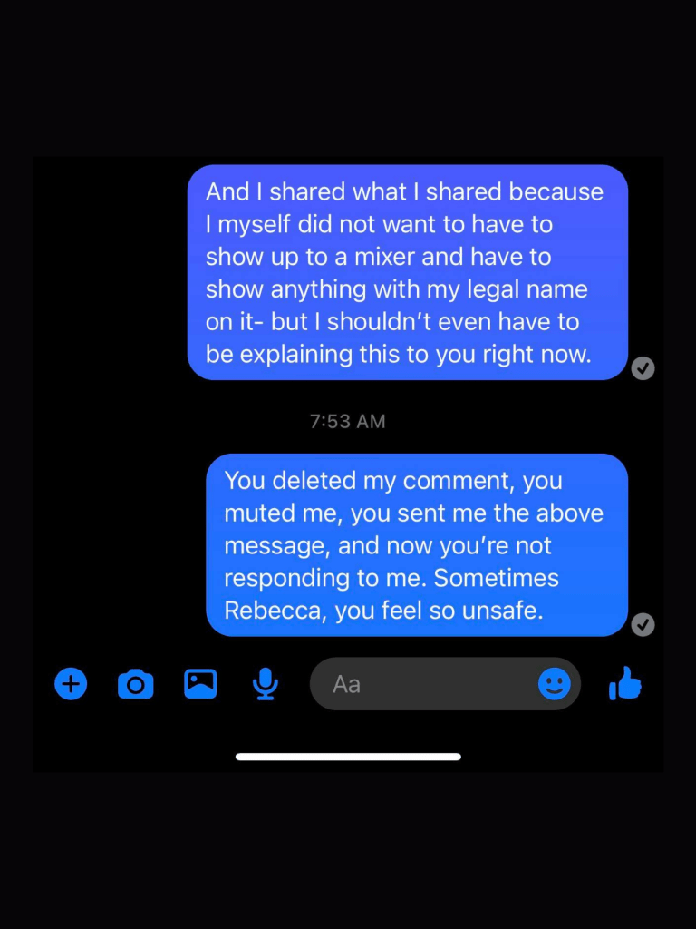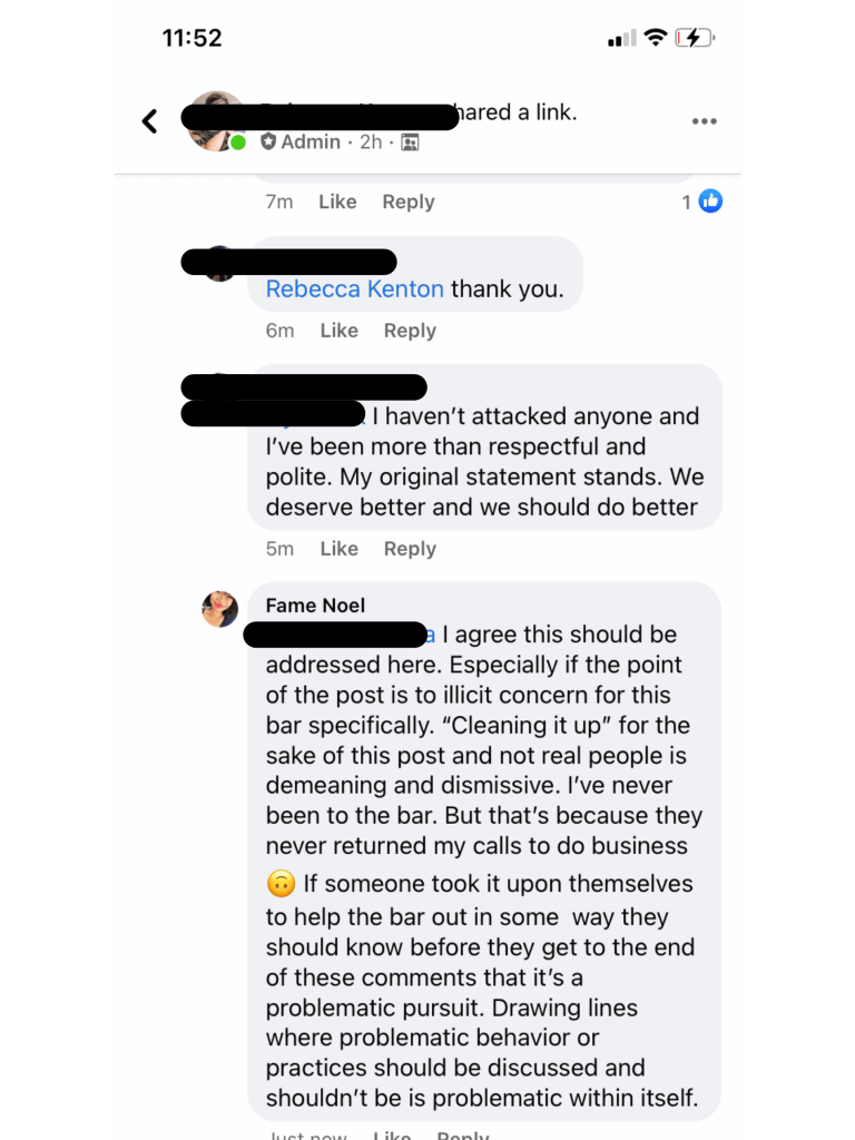 I’m heavily paraphrasing but the group member questioned the continued support of this particular Lesbian bar due to it’s history of “problematic” behavior. I had never actually patronized the bar but being a Queer women’s event curator in Philadelphia certainly contrived my curiosity. We began conversing about the allegations of “problematic behavior” and then the admin hopped on.